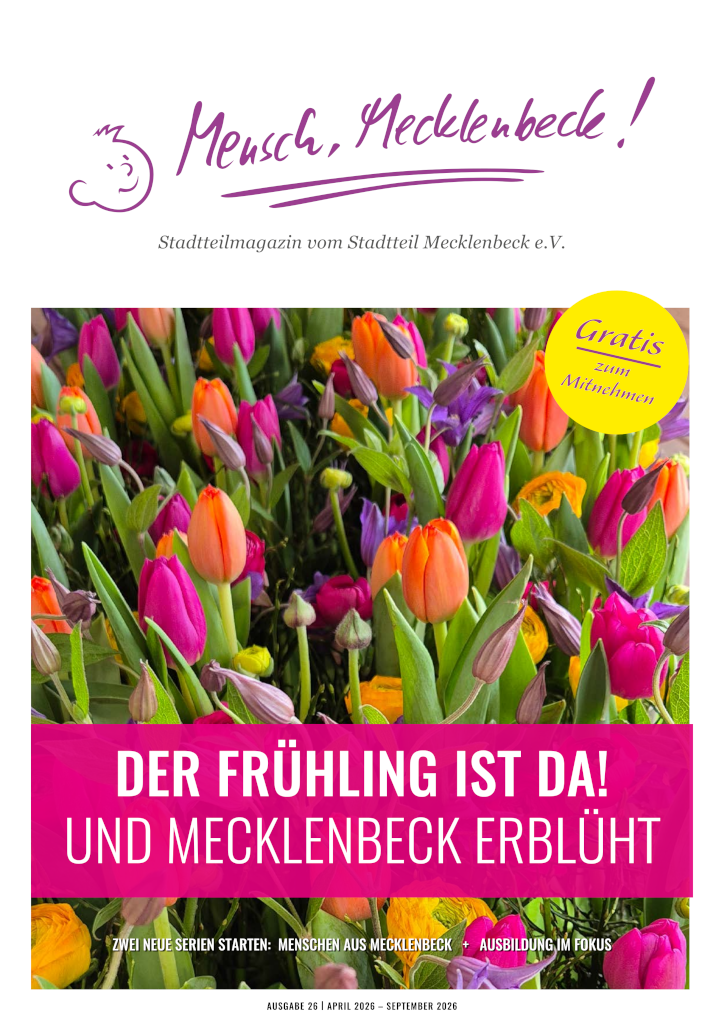 Zweimal im Jahr, im Frühjahr und im Herbst, erscheint unser Stadtteilmagazin „Mensch, Mecklenbeck!“. Es wird in der gesamten Nachbarschaft verteilt und bietet eine Fülle an wissenswerten Informationen über unseren Stadtteil.